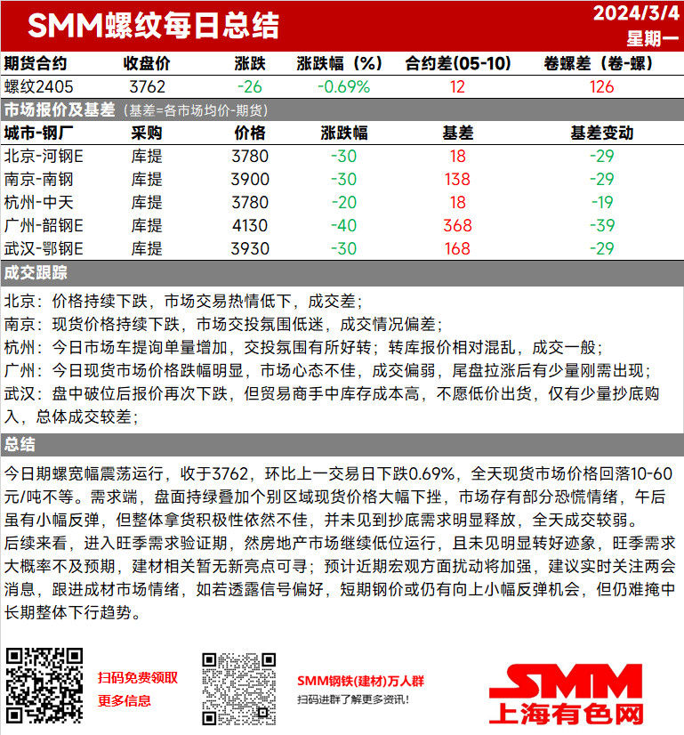 【SMM螺纹日评:两会进行时!宏观方面近期扰动或将加强】今日期螺宽幅震荡运行,收于3762,环比上一交易日下跌0.69%,全天现货市场价格回落10-60元/吨不等······