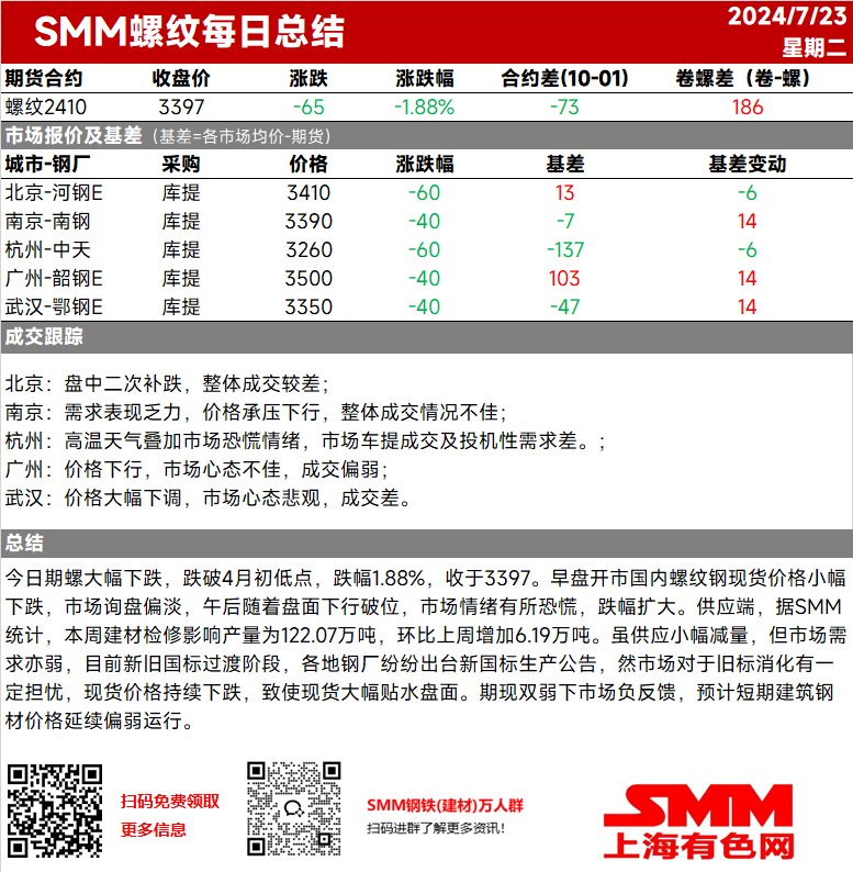 【SMM螺纹日评:期螺破位 现货跌跌不休】今日期螺大幅下跌,跌破4月初低点,跌幅1.88%,收于3397。早盘开市国内螺纹钢现货价格小幅下跌,市场询盘偏淡,午后随着盘面下行破位,市场情绪有所恐慌,跌幅扩大······