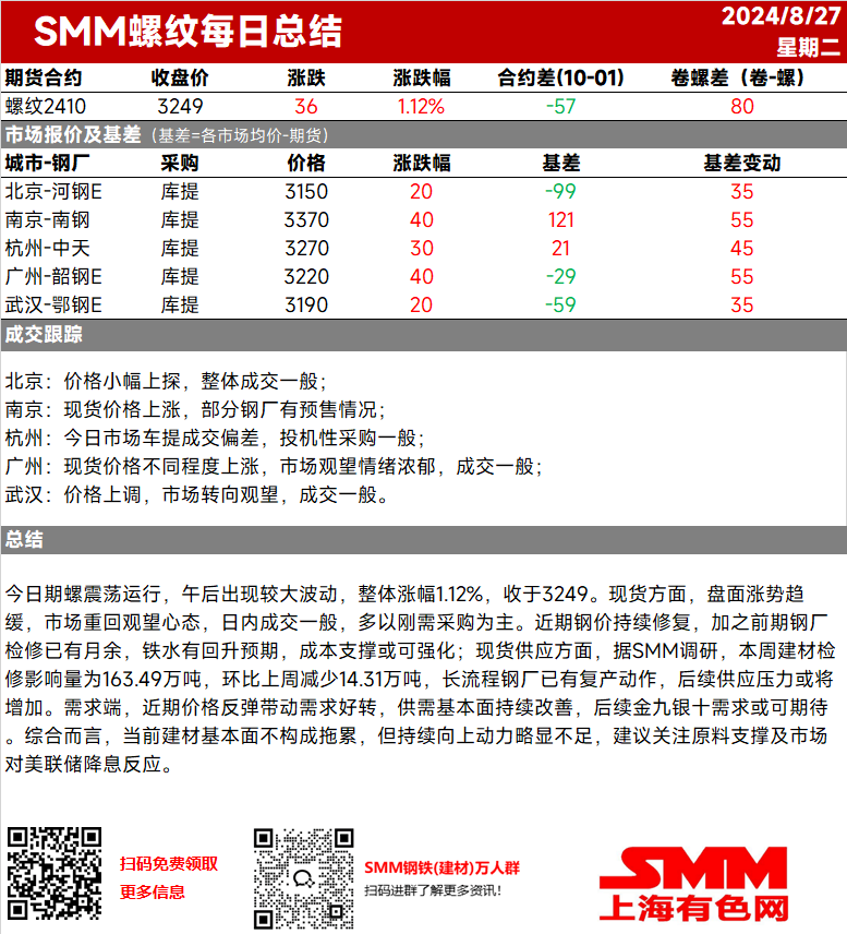 【SMM螺纹日评:反弹暂歇 市场重回观望心态】今日期螺震荡运行,午后出现较大波动,整体涨幅1.12%,收于3249。现货方面,盘面涨势趋缓,市场重回观望心态,日内成交一般,多以刚需采购为主。近期钢价持续修复,加之前期钢厂检修已有月余,铁水有回升预期,成本支撑或可强化;现货供应方面,据SMM调研,本周建材检修影响量为163.49万吨,环比上周减少14.31万吨,长流程钢厂已有复产动作,后续供应压力或将增加。需求端,近期价格反弹带动需求好转,供需基本面持续改善,后续金九银十需求或可期待。综合而言,当前建材基本面不构成拖累,但持续向上动力略显不足,建议关注原料支撑及市场对美联储降息反应。