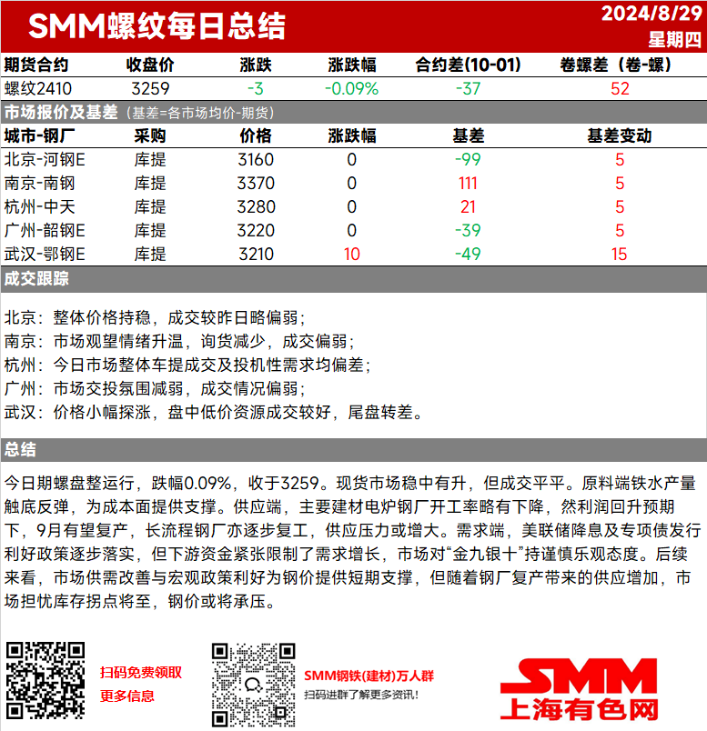 【SMM螺纹日评:库存虽下降加速 但需警惕钢厂产量回升】今日期螺盘整运行,跌幅0.09%,收于3259。现货市场稳中有升,但成交平平。原料端铁水产量触底反弹,为成本面提供支撑。供应端,主要建材电炉钢厂开工率略有下降,然利润回升预期下,9月有望复产,长流程钢厂亦逐步复工,供应压力或增大。需求端,美联储降息及专项债发行利好政策逐步落实,但下游资金紧张限制了需求增长,市场对“金九银十”持谨慎乐观态度。后续来看,市场供需改善与宏观政策利好为钢价提供短期支撑,但随着钢厂复产带来的供应增加,市场担忧库存拐点将至,钢价或将承压。