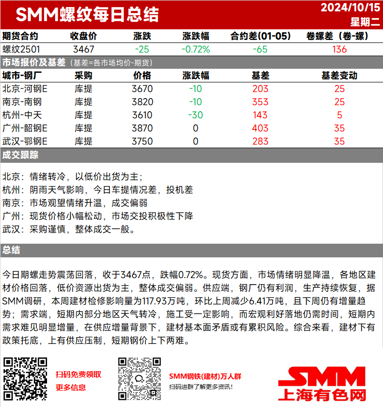 【SMM螺纹日评:盘面走弱 现货成交转冷 】今日期螺走势震荡回落,收于3467点,跌幅0.72%。现货方面,市场情绪明显降温,各地区建材价格回落,低价资源出货为主,整体成交偏弱。供应端,钢厂仍有利润,生产持续恢复,据SMM调研,本周建材检修影响量为117.93万吨,环比上周减少6.41万吨,且下周仍有增量趋势;需求端,短期内部分地区天气转冷,施工受一定影响,而宏观利好落地仍需时间,短期内需求难见明显增量,在供应增量背景下,建材基本面矛盾或有累积风险。综合来看,建材下有政策托底,上有供应压制,短期钢价上下两难。