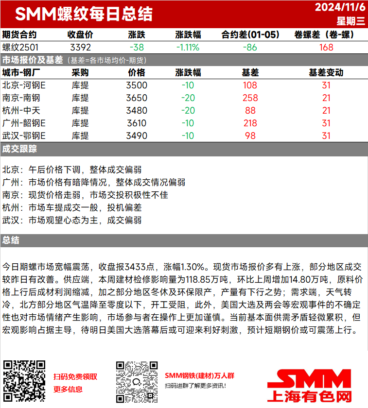 【SMM螺纹日评:特朗普赢得选举 两会决策成为关注焦点 】今日期螺震荡下行,收于3392点,跌幅1.11%。早盘现货多数报价持稳,但午后随盘面下跌,多数地区现货跟跌,市场心态谨慎,整体成交偏弱。本周长流程钢厂检修小幅增加,且短流程钢厂开工率有所下滑,供应端压力减轻