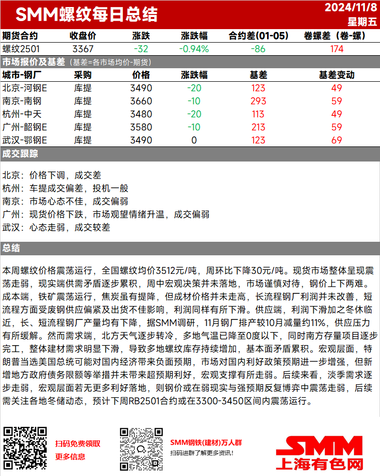 【SMM螺纹日评:钢价震荡下行 宏观预期已落空? 】本周螺纹价格震荡运行,全国螺纹均价3512元/吨,周环比下降30元/吨。现货市场整体呈现震荡走弱,现实端供需矛盾逐步累积,周中宏观决策并未落地,市场谨慎对待,钢价上下两难。成本端,铁矿震荡运行,焦炭虽有提降,但成材价格并未走高,长流程钢厂利润并未改善,短流程方面受废钢供应偏紧及出货不佳影响,利润同样有所下滑···