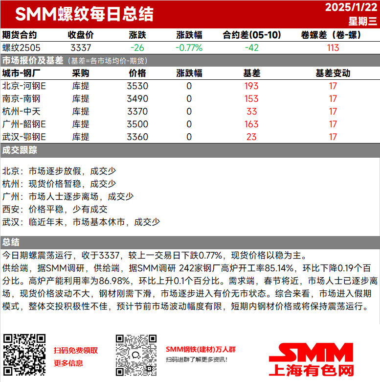 【SMM螺纹日评:期螺震荡运行 市场人士已逐步离场】今日期螺震荡运行,收于3337,较上一交易日下跌0.77%,现货价格以稳为主······