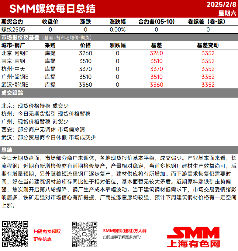 【SMM螺纹日评:现货价格平稳 市场成交较少】今日无期货盘面,市场部分商户未调休,各地现货报价基本平稳,成交偏少······