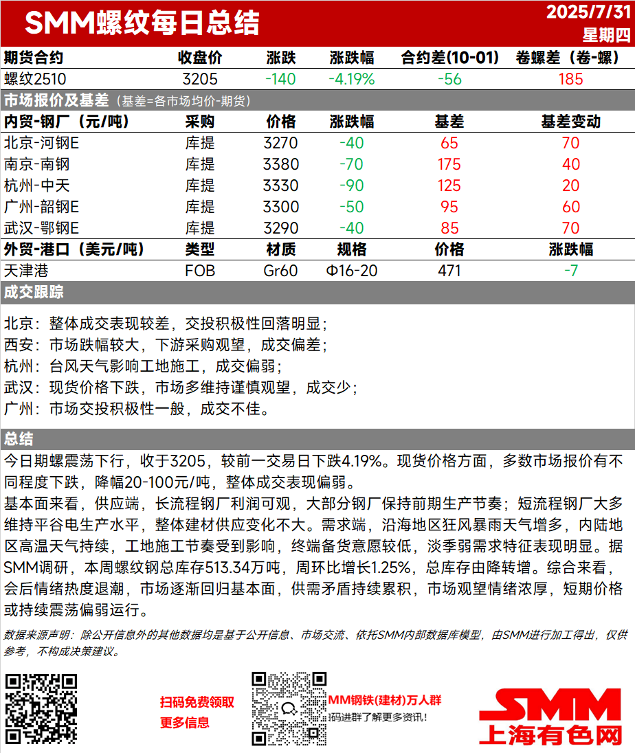 【SMM螺纹日评:期螺速降140点 市场情绪“急转弯”】今日期螺震荡下行,收于3205,较前一交易日下跌4.19%。现货价格方面,多数市场报价有不同程度下跌,降幅20-100元/吨,整体成交表现偏弱。