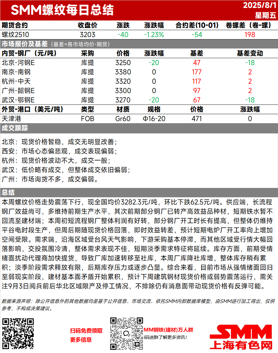 本周螺纹价格走势震荡下行,现全国均价3282.3元/吨,环比下跌62.5元/吨。供应端,长流程钢厂效益尚可,多维持前期生产水平,其次前期部分钢厂已转产高效益品种材,短期铁水暂不回流至建材端;本周初短流程钢厂整体利润有好转,部分钢厂开工时长有提高,但整体仍维持平谷电时段生产,但周后期随现货价格回落,即时效益转差,预计短期电炉厂开工率向上增加空间受限。需求端,沿海区域受台风天气影响,下游采购基本停滞,而其他区域受行情大幅回落影响,交投氛围冷清,整体需求表现不佳,短期淡季需求特征将延续。库存方面,前期受情绪面扰动代理商加快提货,导致厂库加速转移至社库,本周厂库降社库增,整体库存稍有累积;淡季阶段需求释放有限,后期库存压力或逐步凸显。综合来看,目前市场从强情绪面回归至弱现实阶段,建材基本面矛盾开始累积,预计下周建筑钢材现货价格或弱势震荡运行,需关注9月3日阅兵前后华北区域限产及停工情况,不排除仍有消息面带动现货价格有反弹可能。