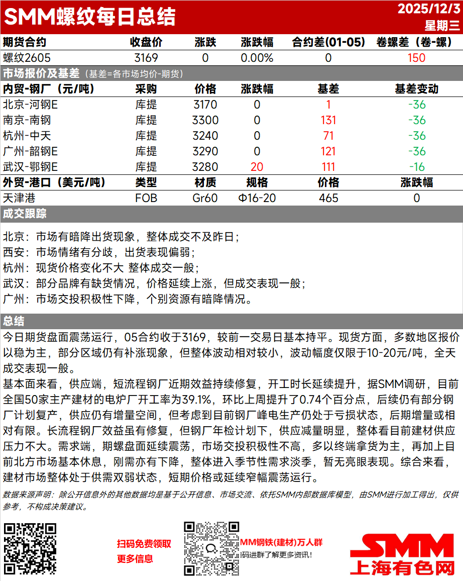【SMM螺纹日评:长短流程供应分化 建材价格或将延续震荡运行】今日期货盘面震荡运行,05合约收于3169,较前一交易日基本持平。现货方面,多数地区报价以稳为主,部分区域仍有补涨现象,但整体波动相对较小,波动幅度仅限于10-20元/吨,全天成交表现一般……