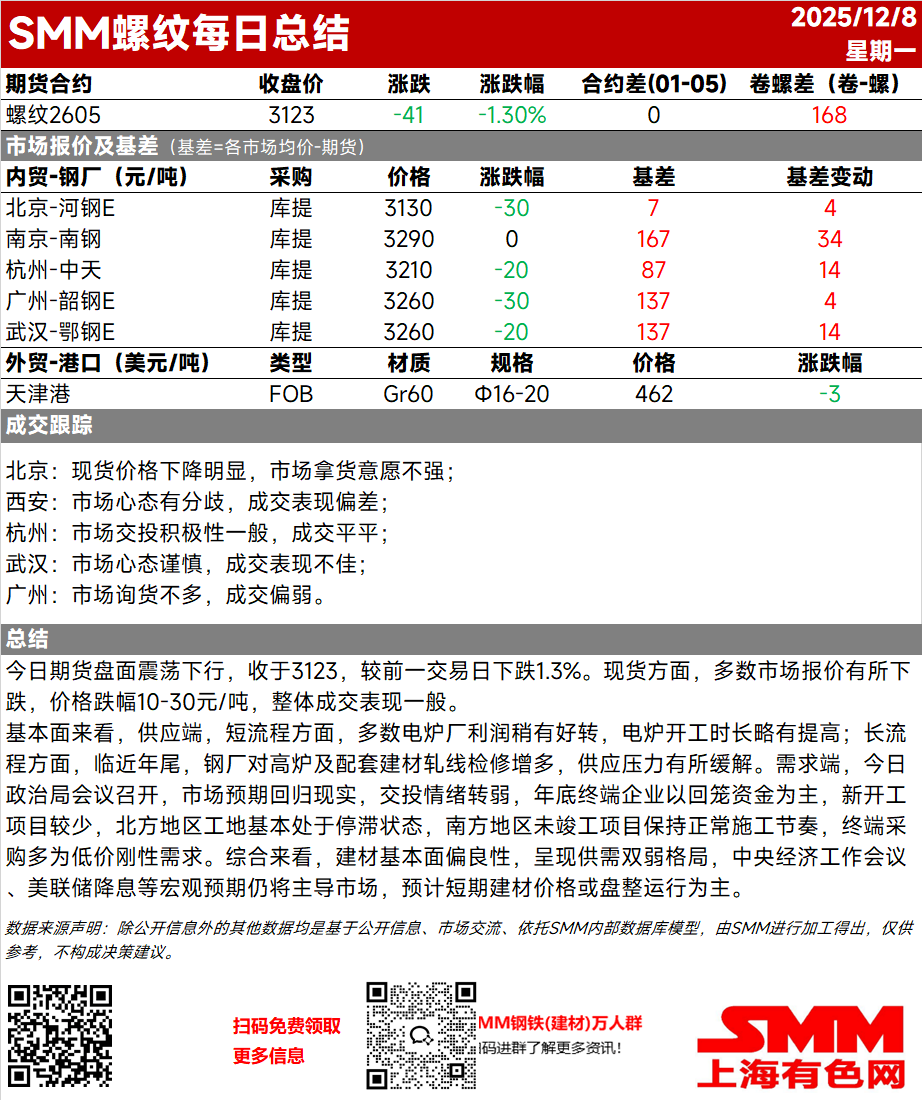 【SMM螺纹日评:政治局会议召开 建材价格随预期回归承压运行】今日期货盘面震荡下行,收于3123,较前一交易日下跌1.3%。现货方面,多数市场报价有所下跌,价格跌幅10-30元/吨,整体成交表现一般。