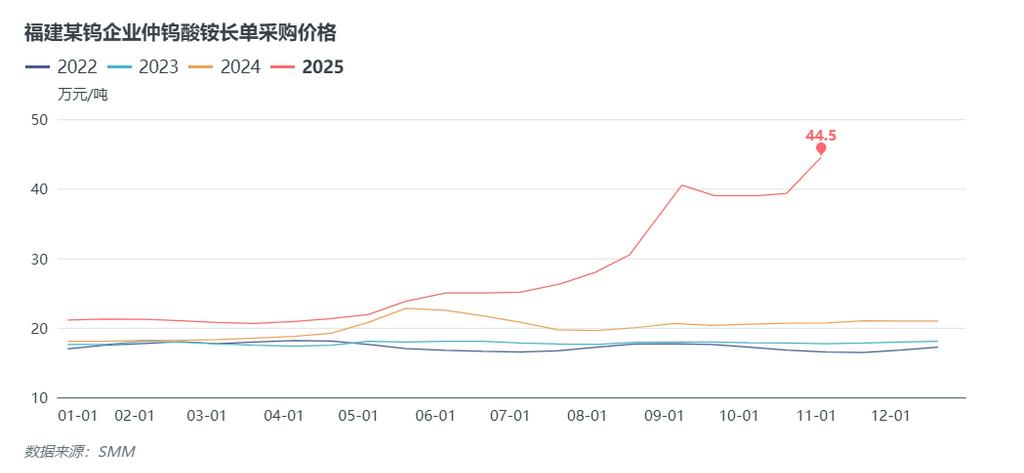 福建某钨企11月下半月APT长单价涨2.5万【11月下半月钨长单信息】SMM11月17日讯:据悉,福建某钨企2025年11月下半月外购APT长单定价为47万元/吨,较上半月报价上调2.5万元/吨。11-17 11:06