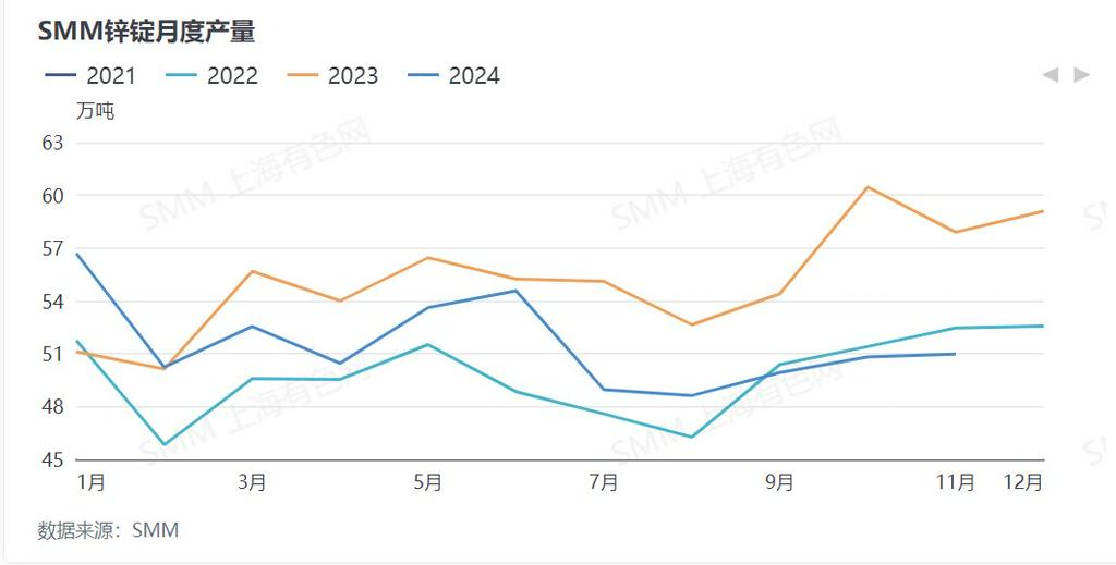 供应端。11月SMM中国精炼锌产量环比微增0.1万吨,整体运行表现高于预期,但产量绝对水平看仍较低,加上月内进口锌锭窗口持续关闭,整体进口流入量预计有限,11月国内锌锭供应持续偏弱。进入12月,受国内多个地区的产量恢复以及年内增产影响,整体12月产量预计较11月环比回升,锌锭供应低水平或有所改善。