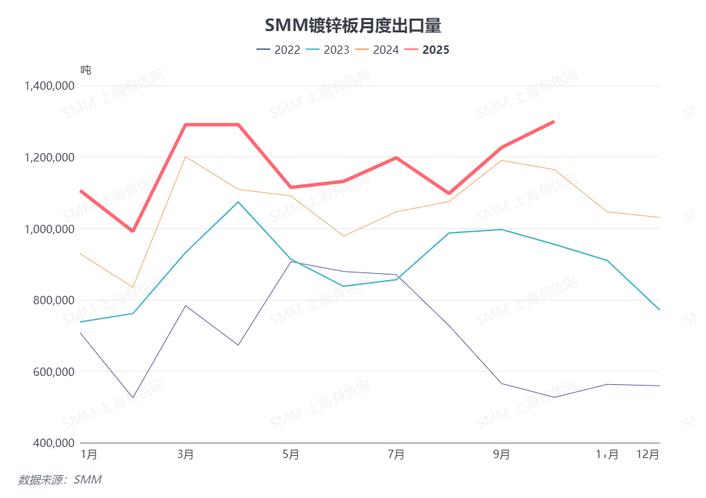 出口市场:出口市场的扩大同样带来镀锌板需求的提高。据最新海关数据显示,2025年10月镀锌板出口量为129.94万吨,2025年1-10月累计镀锌板出口量为1174.38万吨,累计同比2025年的1066.99万吨增加10.07%。随着一些东南亚、非洲国家基础设施建设及工业化进程推动,预计未来海外对镀锌板的需求将持续增长,成为中国镀锌板需求的重要增长点之一。
