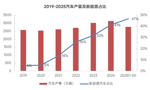 新能源汽车行业:近些年中国新能源汽车出现爆发式增长,据中汽协数据统计,2025年1-10月新能源汽车销量达到汽车新车总销量的46.7%,新能源汽车即将占据中国汽车的半壁江山,而随着汽车市场继续扩张,至2030年,新能源汽车占比预计将提升至80%左右。扩张的汽车市场不断提振镀锌板消费,由此带来大量的产能上新。但值得注意的是,在轻量化趋势下,新能源汽车的钢材用量较传统燃油车有一定程度萎缩,其中部分钢板的减量已被更轻的铝合金材料替代,进而影响其整车的镀锌钢板的用量,因此新能源汽车对镀锌板的消费提振预计随着占比的提高将逐渐放缓。
